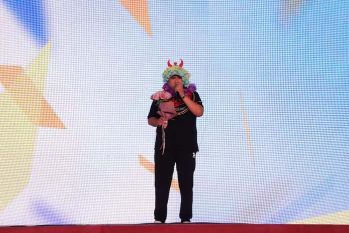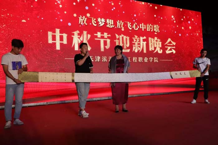 晚会进行中,2018级电子技术二班郭旭同学,在舞台上亲手将自己花了一周时间创作的5米书法长卷赠送给贾秀芳理事长,以表达对学院的深厚感情和对理事长的敬佩之情。理事长欣然接受,并与同学们亲切互动,将晚会气氛推向高潮。