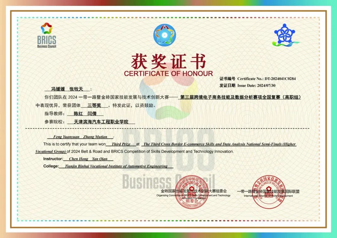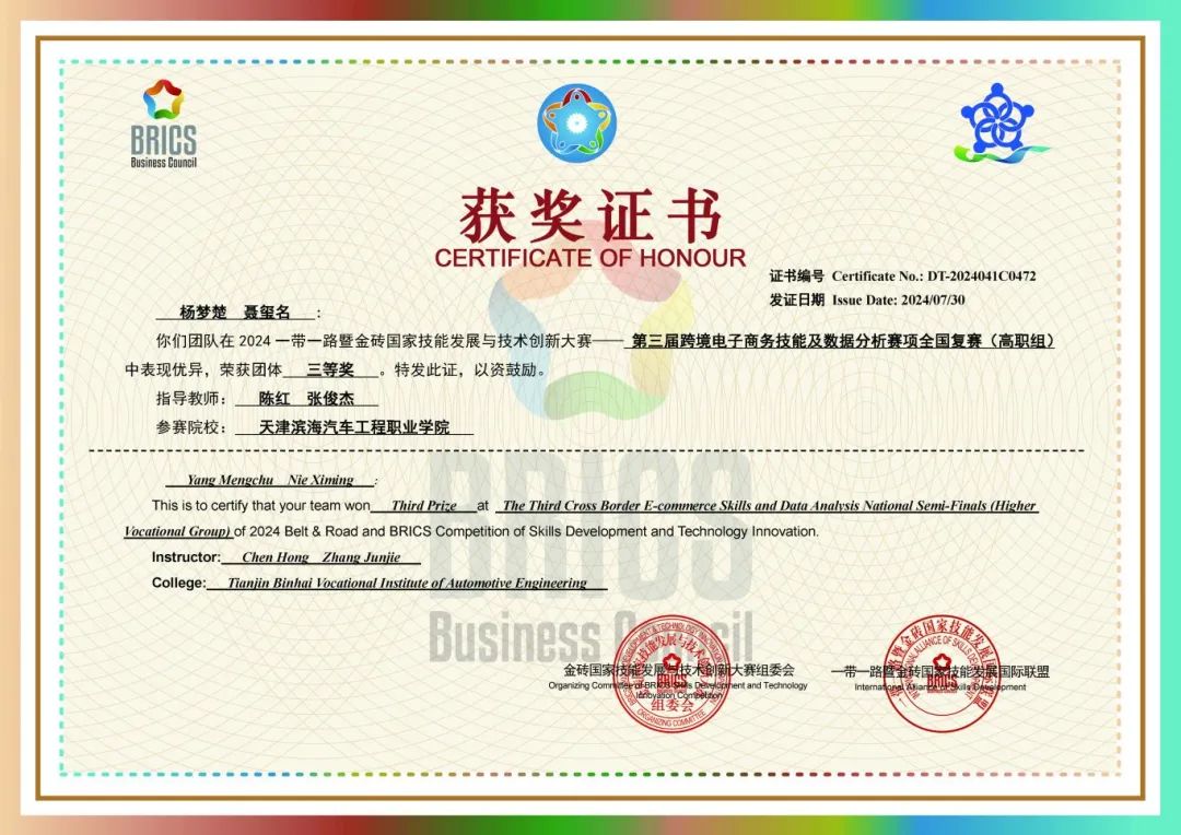 近日,由金砖国家工商理事会中方理事会、一带一路暨金砖国家技能发展国际联盟、中国科协“一带一路”暨金砖国家技能发展与技术创新培训中心主办,中国发明协会、教育部中外人文交流中心联合主办,金砖国家工商理事会技能发展、应用技术与创新中方工作组承办的2024一带一路暨金砖国家技能发展与技术创新大赛拉开序幕。经过激烈的角逐,我校信息工程学院教师陈红领队,与闫倩、张俊杰老师带领学生杨梦楚、聂玺名、冯媛媛、张牧天、盖文琪、王洋、韩杨、孙琢等8名学生荣获团体三等奖3项、团体优秀奖1项。